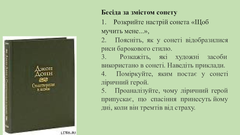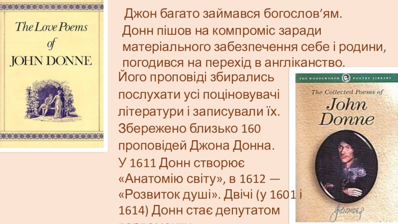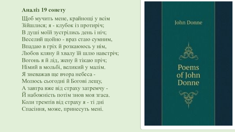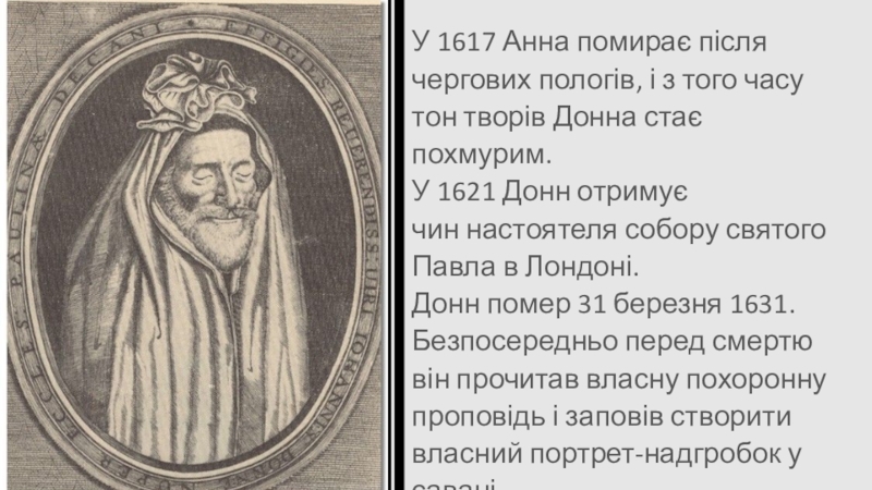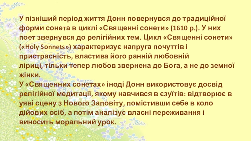 Слайд 29У пізніший період життя Донн повернувся до традиційної форми сонета в