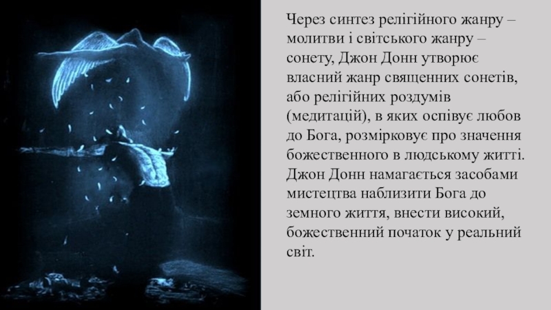 Слайд 44Через синтез релігійного жанру – молитви і світського жанру – сонету,