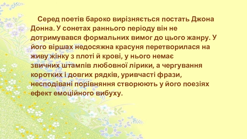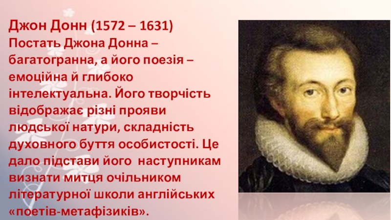 Слайд 28Серед поетів бароко вирізняється постать Джона Донна. У сонетах раннього періоду