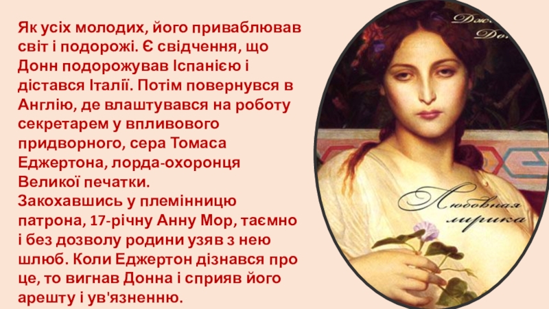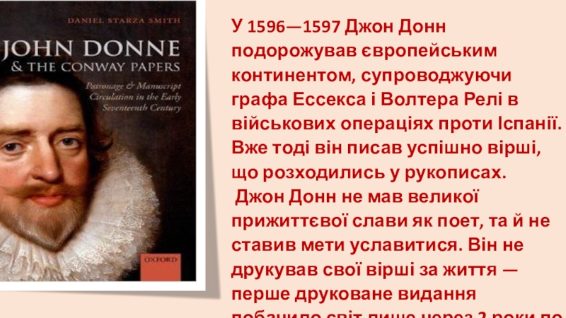 Слайд 13У 1596—1597 Джон Донн подорожував європейським континентом, супроводжуючи графа Ессекса і Волтера