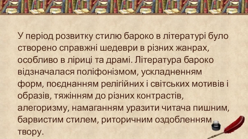 Слайд 27Література бароко вирізняється ускладненою формою, поєднанням релігійних і світських образів та