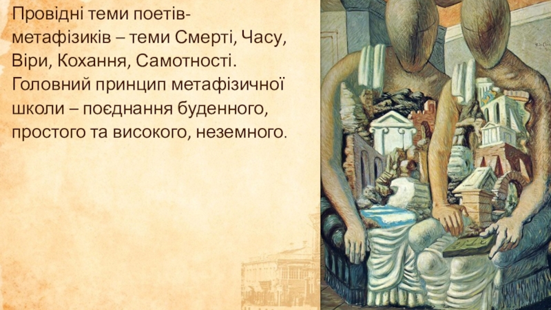 Слайд 38Провідні теми поетів-метафізиків – теми Смерті, Часу, Віри, Кохання, Самотності.