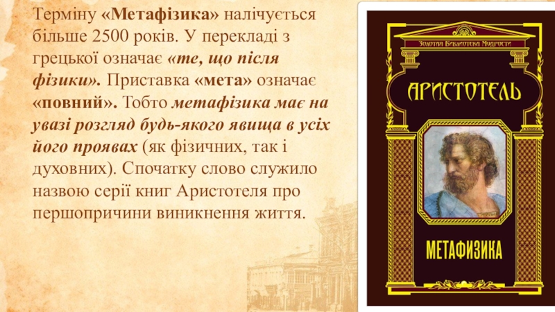 Слайд 33Терміну «Метафізика» налічується більше 2500 років. У перекладі з грецької означає