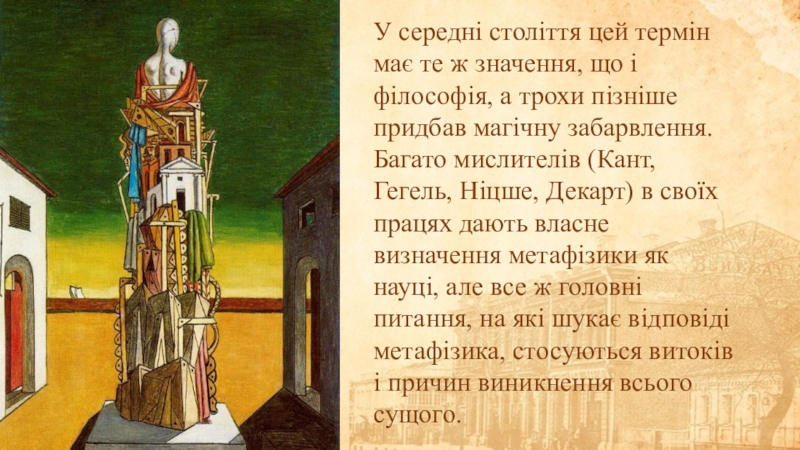 філософія, а трохи пізніше придбав магічну забарвлення. Багато мислителів (Кант, Гегель, Ніцше, Декарт) в своїх працях дають власне визначення метафізики як науці, але все ж головні питання, на які шукає відповіді метафізика, стосуються витоків і причин виникнення всього сущого.