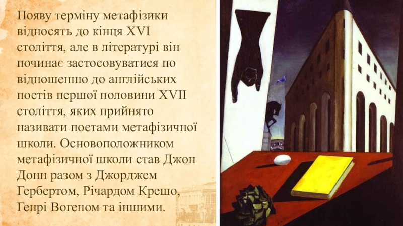 Слайд 36Появу терміну метафізики відносять до кінця XVI століття, але в літературі