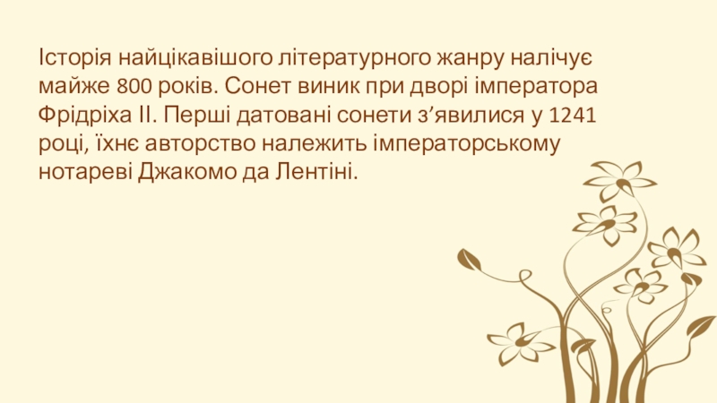 Слайд 24Історія найцікавішого літературного жанру налічує майже 800 років. Сонет виник при