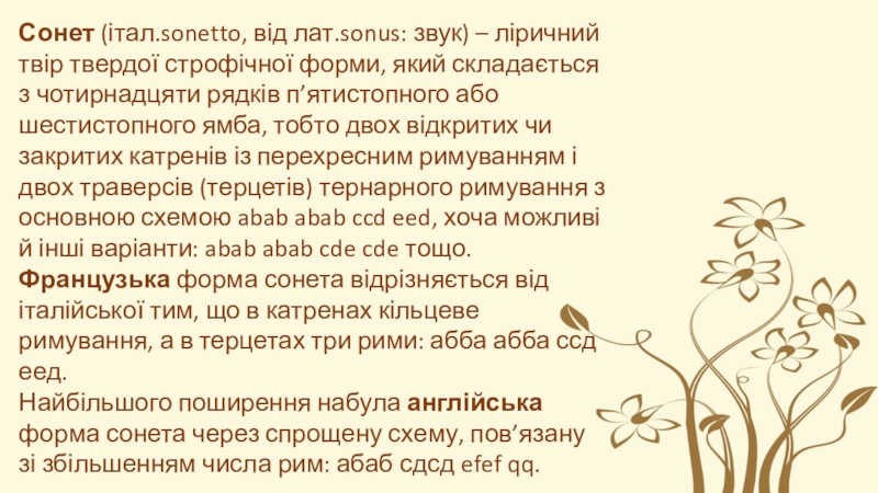 Слайд 23Сонет (італ.sonetto, від лат.sonus: звук) – ліричний твір твердої строфічної форми,