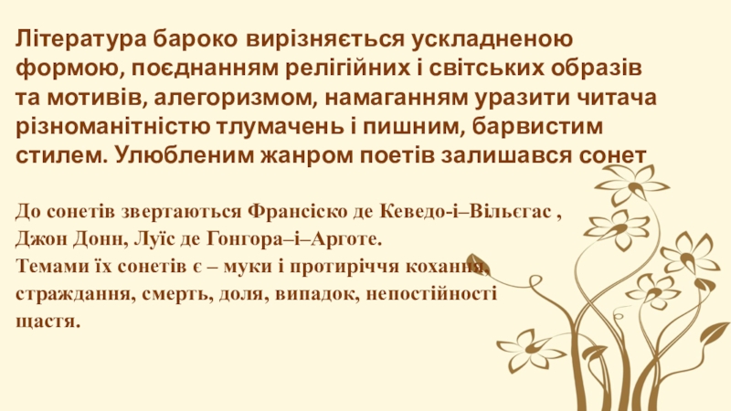 мотивів, алегоризмом, намаганням уразити читача різноманітністю тлумачень і пишним, барвистим стилем. Улюбленим жанром поетів залишався сонет