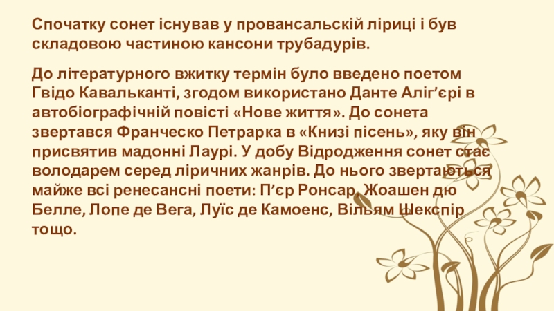 Слайд 25Спочатку сонет існував у провансальскій ліриці і був складовою частиною кансони