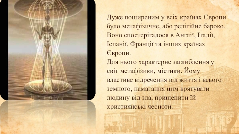 Слайд 35Дуже поширеним у всіх країнах Європи було метафізичне, або релігійне бароко.
