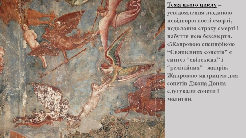 Слайд 43Тема цього циклу – усвідомлення людиною невідворотності смерті, подолання страху смерті