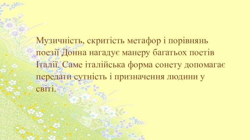 Слайд 31Музичність, скритість метафор і порівнянь поезії Донна нагадує манеру багатьох поетів