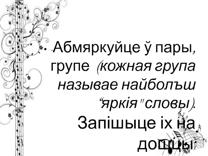 Слайд 6- Абмяркуйце ў пары, групе (кожная група называе найболъш “яркія" словы). Запішыце