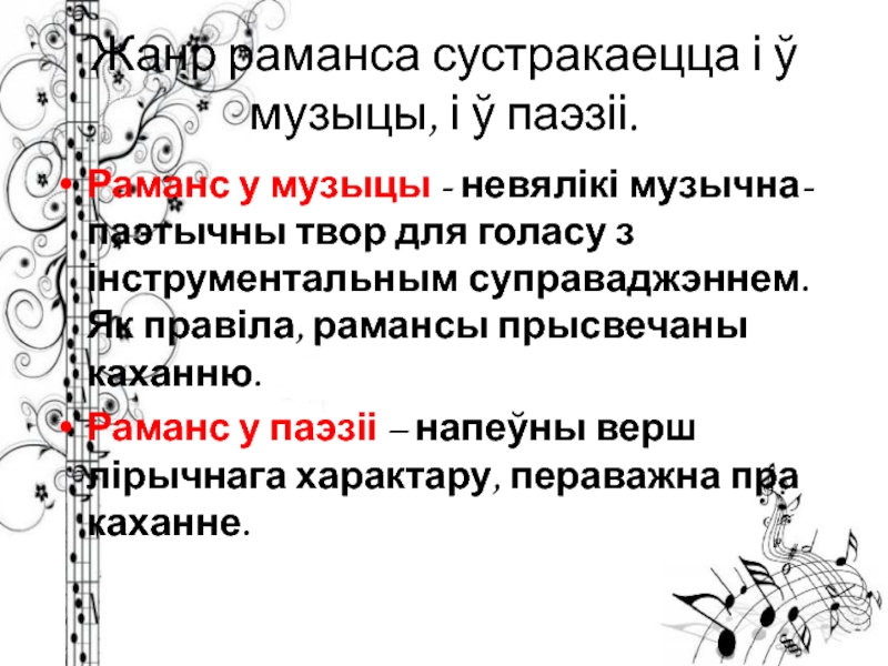 Слайд 3Жанр раманса сустракаецца і ў музыцы, і ў паэзіі.