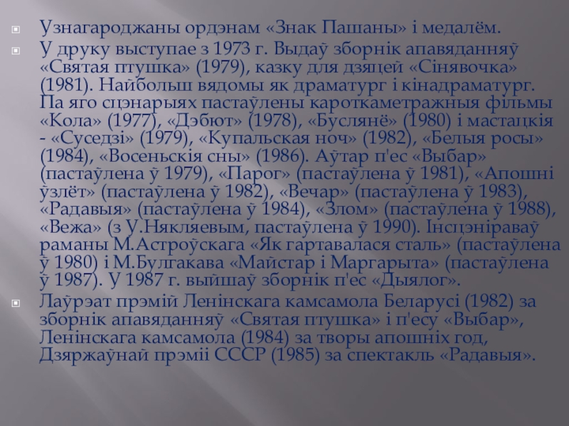 Слайд 3Узнагароджаны ордэнам «Знак Пашаны» і медалём.