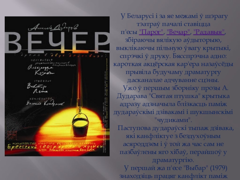 "Парог" (1983) — першы шырокавядомы твор Аляксея Дударава, які выклікаў ажыўленую палеміку ў прэсе.