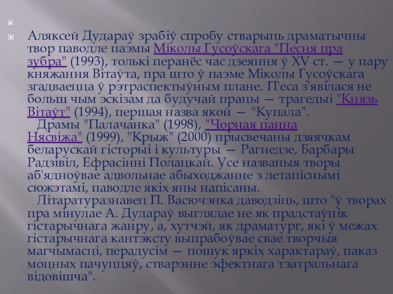 Аляксей Дудараў зрабіў спробу стварыць драматычны твор паводле паэмы Міколы Гусоўскага "Песня