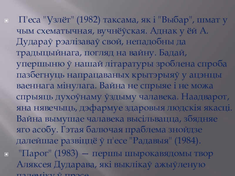 вучнёўская. Аднак у ёй А. Дудараў рэалізаваў свой, непадобны да традыцыйнага, погляд на вайну. Бадай, упершыню ў нашай літаратуры зроблена спроба пазбегнуць напрацаваных крытэрыяў у ацэнцы ваеннага мінулага. Вайна не спрыяе і не можа спрыяць духоўнаму ўздыму чалавека. Наадварот, яна нявечыць, дэфармуе здаровыя людскія якасці. Вайна вымушае чалавека высільвацца, збядняе яго асобу. Гэтая балючая праблема знойдзе далейшае развіццё ў п'есе "Радавыя" (1984).