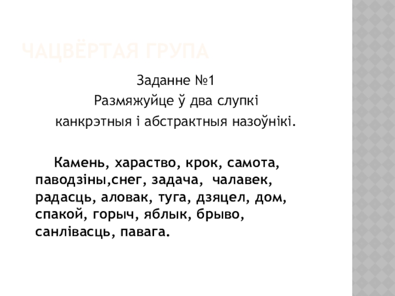 Камень, хараство, крок, самота, паводзіны,снег, задача, чалавек, радасць, аловак, туга, дзяцел, дом, спакой, горыч, яблык, брыво, санлівасць, павага.
