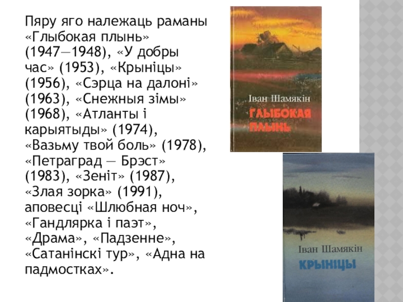 Слайд 6Пяру яго належаць раманы «Глыбокая плынь» (1947—1948), «У добры час» (1953),