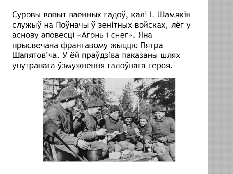 Слайд 8Суровы вопыт ваенных гадоў, калі I. Шамякін служыў на Поўначы ў