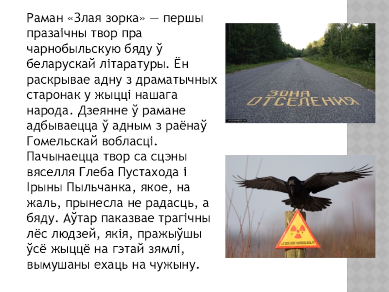 Слайд 7Раман «Злая зорка» — першы празаічны твор пра чарнобыльскую бяду ў