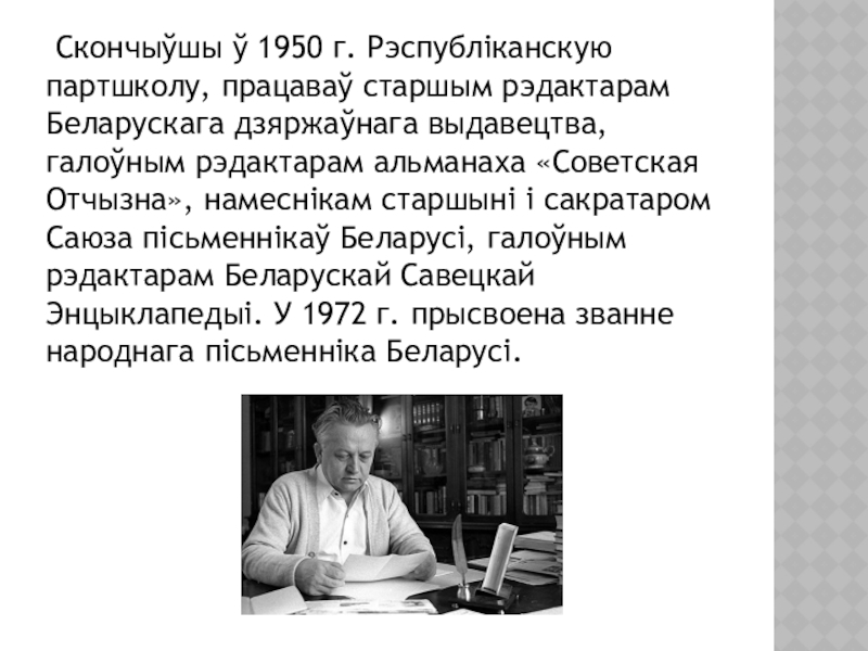 Слайд 3 Скончыўшы ў 1950 г. Рэспубліканскую партшколу, працаваў старшым рэдактарам Беларускага