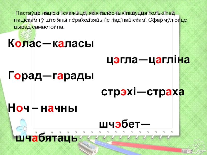Пастаўце націскі і скажыце, якія галосныя пішуцца толькі пад націскам