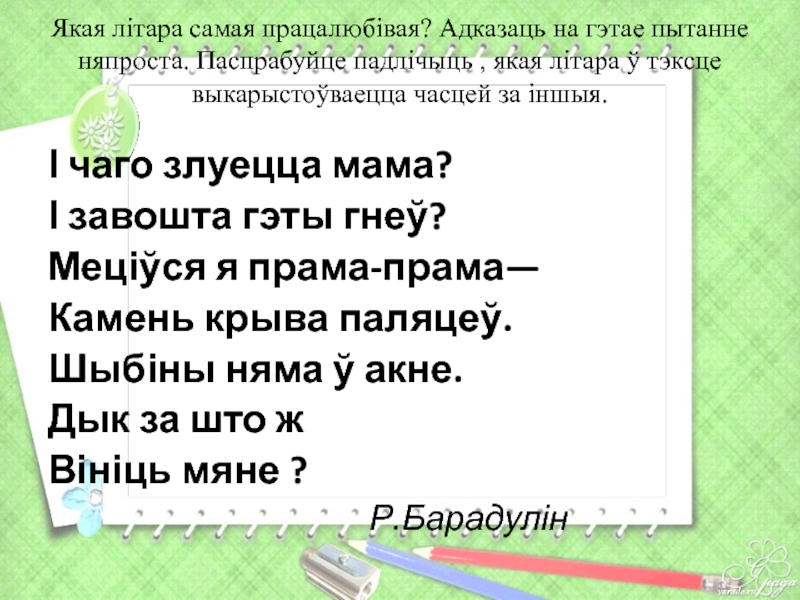 Слайд 5Якая літара самая працалюбівая? Адказаць на гэтае пытанне няпроста. Паспрабуйце падлічыць