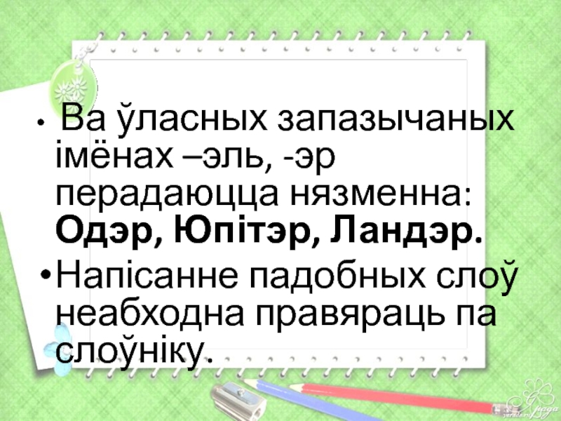 Слайд 23 Ва ўласных запазычаных імёнах –эль, -эр перадаюцца нязменна: Одэр, Юпітэр,
