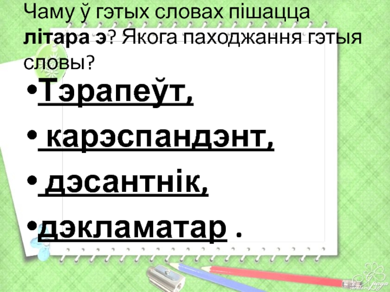 Слайд 16Чаму ў гэтых словах пішацца літара э? Якога паходжання гэтыя словы?