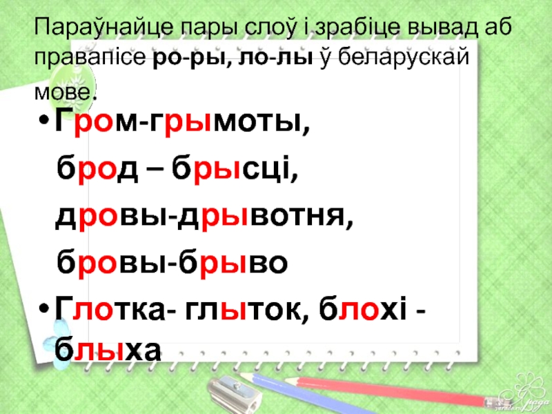 Слайд 11Параўнайце пары слоў і зрабіце вывад аб правапісе ро-ры, ло-лы ў