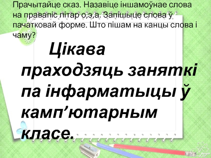 Слайд 19Прачытайце сказ. Назавіце іншамоўнае слова на правапіс літар о,э,а. Запішыце слова