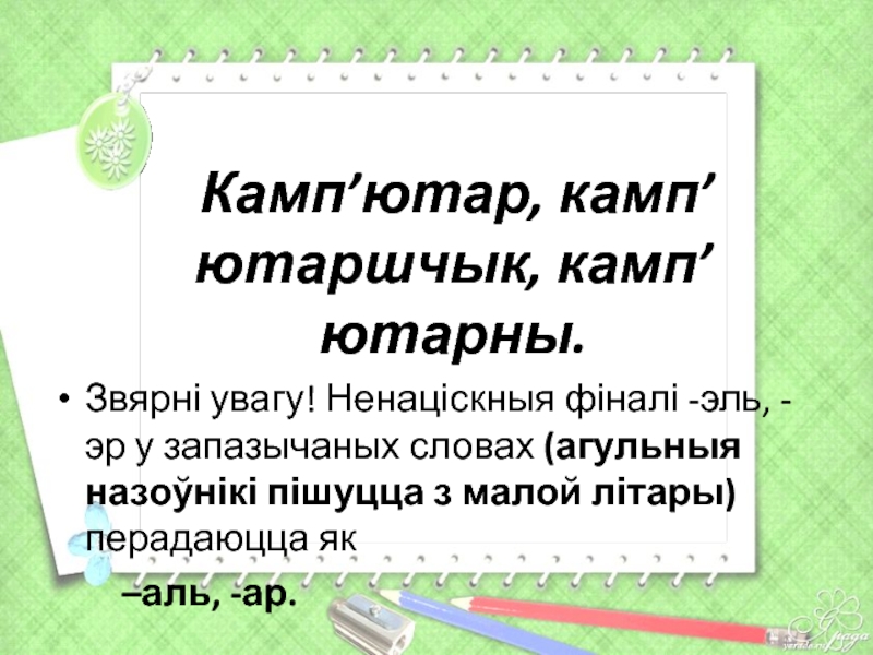 Слайд 20 Камп’ютар, камп’ютаршчык, камп’ютарны.