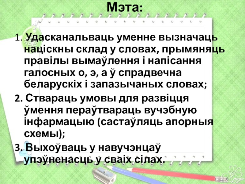 1. Удасканальваць уменне вызначаць націскны склад у словах, прымяняць правілы вымаўлення