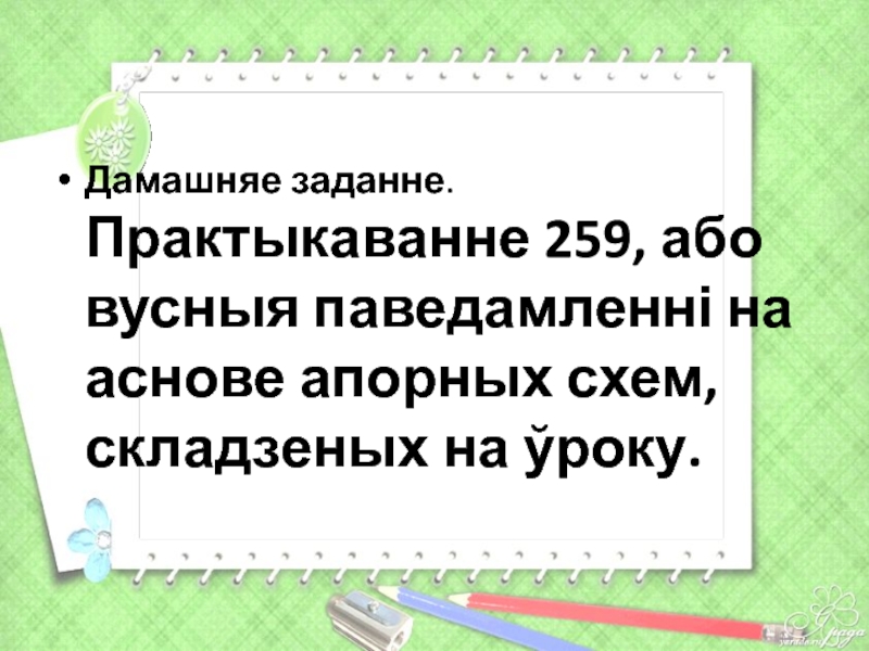 Слайд 29Дамашняе заданне. Практыкаванне 259, або вусныя паведамленні на аснове апорных схем,