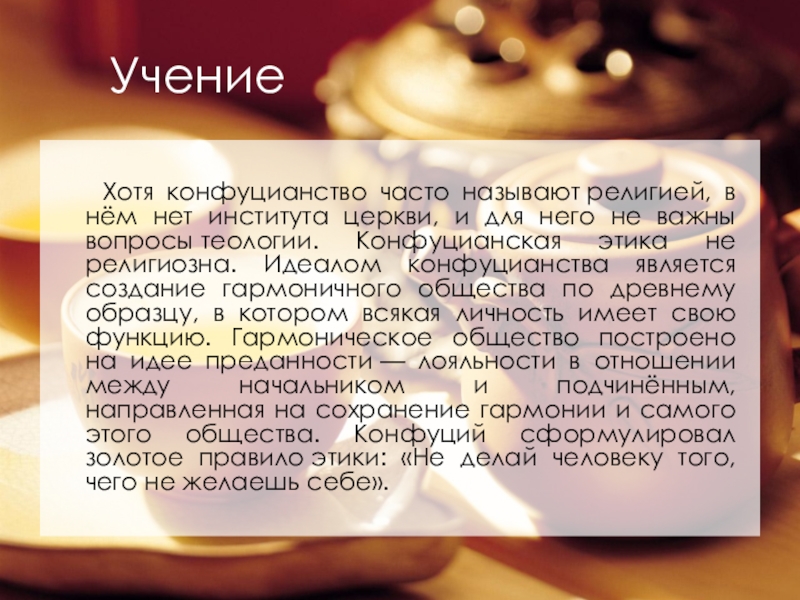 и для него не важны вопросы теологии. Конфуцианская этика не религиозна. Идеалом конфуцианства является создание гармоничного общества по древнему образцу, в котором всякая личность имеет свою функцию. Гармоническое общество построено на идее преданности — лояльности в отношении между начальником и подчинённым, направленная на сохранение гармонии и самого этого общества. Конфуций сформулировал золотое правило этики: «Не делай человеку того, чего не желаешь себе».