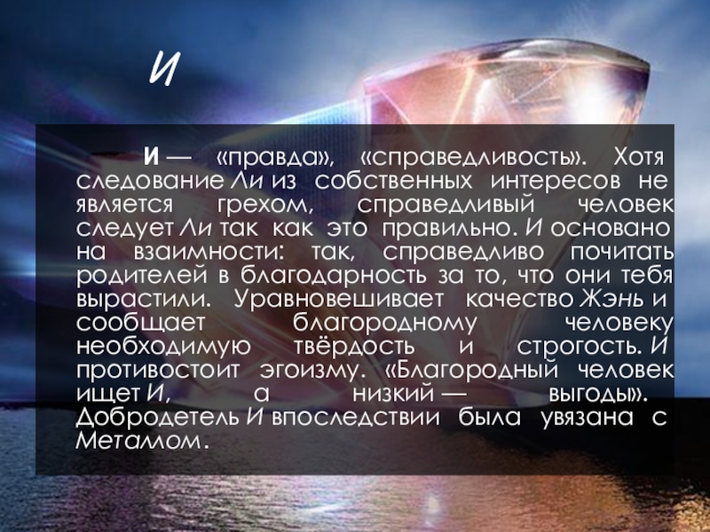грехом, справедливый человек следует Ли так как это правильно. И основано на взаимности: так, справедливо почитать родителей в благодарность за то, что они тебя вырастили. Уравновешивает качество Жэнь и сообщает благородному человеку необходимую твёрдость и строгость. И противостоит эгоизму. «Благородный человек ищет И, а низкий — выгоды». Добродетель И впоследствии была увязана с Металлом.
