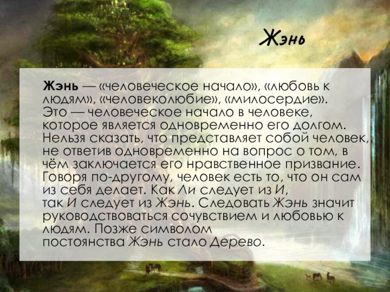 начало в человеке, которое является одновременно его долгом. Нельзя сказать, что представляет собой человек, не ответив одновременно на вопрос о том, в чём заключается его нравственное призвание. Говоря по-другому, человек есть то, что он сам из себя делает. Как Ли следует из И, так И следует из Жэнь. Следовать Жэнь значит руководствоваться сочувствием и любовью к людям. Позже символом постоянства Жэнь стало Дерево.