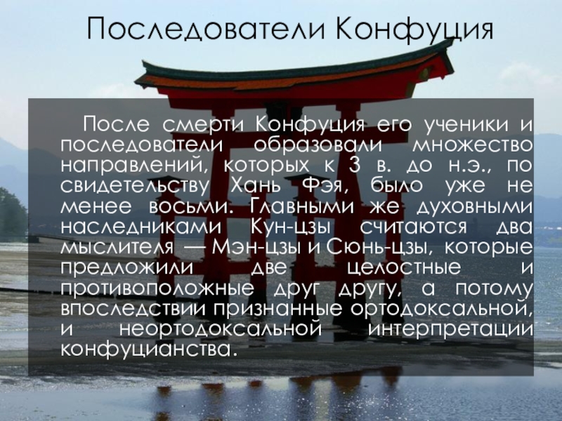 множество направлений, которых к 3 в. до н.э., по свидетельству Хань Фэя, было уже не менее восьми. Главными же духовными наследниками Кун-цзы считаются два мыслителя — Мэн-цзы и Сюнь-цзы, которые предложили две целостные и противоположные друг другу, а потому впоследствии признанные ортодоксальной, и неортодоксальной интерпретации конфуцианства.