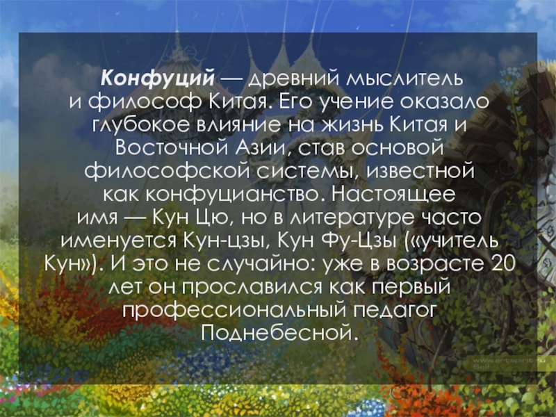 глубокое влияние на жизнь Китая и Восточной Азии, став основой философской системы, известной как конфуцианство. Настоящее имя — Кун Цю, но в литературе часто именуется Кун-цзы, Кун Фу-Цзы («учитель Кун»). И это не случайно: уже в возрасте 20 лет он прославился как первый профессиональный педагог Поднебесной.