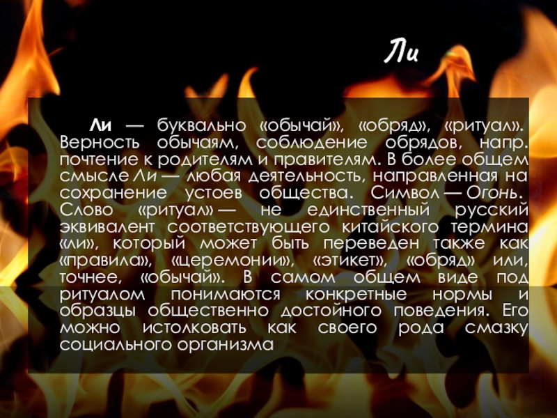 обрядов, напр. почтение к родителям и правителям. В более общем смысле Ли — любая деятельность, направленная на сохранение устоев общества. Символ — Огонь. Слово «ритуал» — не единственный русский эквивалент соответствующего китайского термина «ли», который может быть переведен также как «правила», «церемонии», «этикет», «обряд» или, точнее, «обычай». В самом общем виде под ритуалом понимаются конкретные нормы и образцы общественно достойного поведения. Его можно истолковать как своего рода смазку социального организма