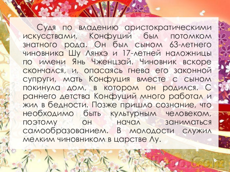 Слайд 4 Судя по владению аристократическими искусствами, Конфуций был потомком знатного