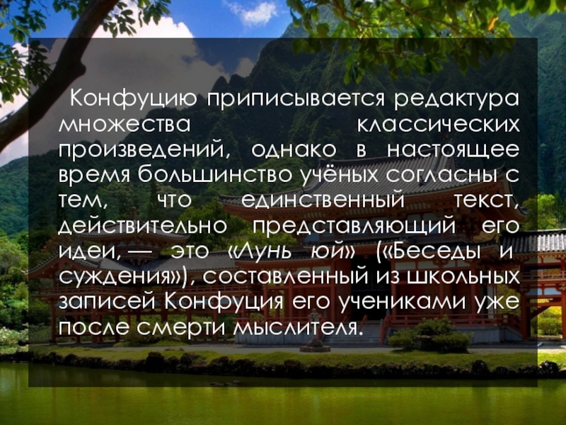 Слайд 15 Конфуцию приписывается редактура множества классических произведений, однако в настоящее
