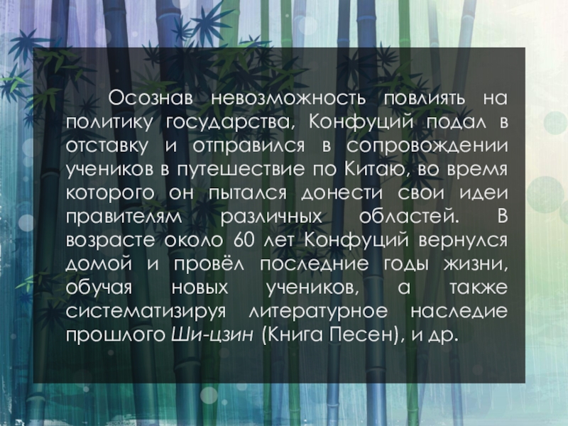 отставку и отправился в сопровождении учеников в путешествие по Китаю, во время которого он пытался донести свои идеи правителям различных областей. В возрасте около 60 лет Конфуций вернулся домой и провёл последние годы жизни, обучая новых учеников, а также систематизируя литературное наследие прошлого Ши-цзин (Книга Песен), и др.