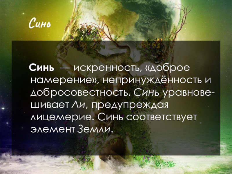 Синь — искренность, «доброе намерение», непринуждённость и добросовестность. Синь уравнове-шивает Ли, предупреждая