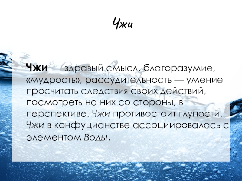 следствия своих действий, посмотреть на них со стороны, в перспективе. Чжи противостоит глупости. Чжи в конфуцианстве ассоциировалась с элементом Воды.