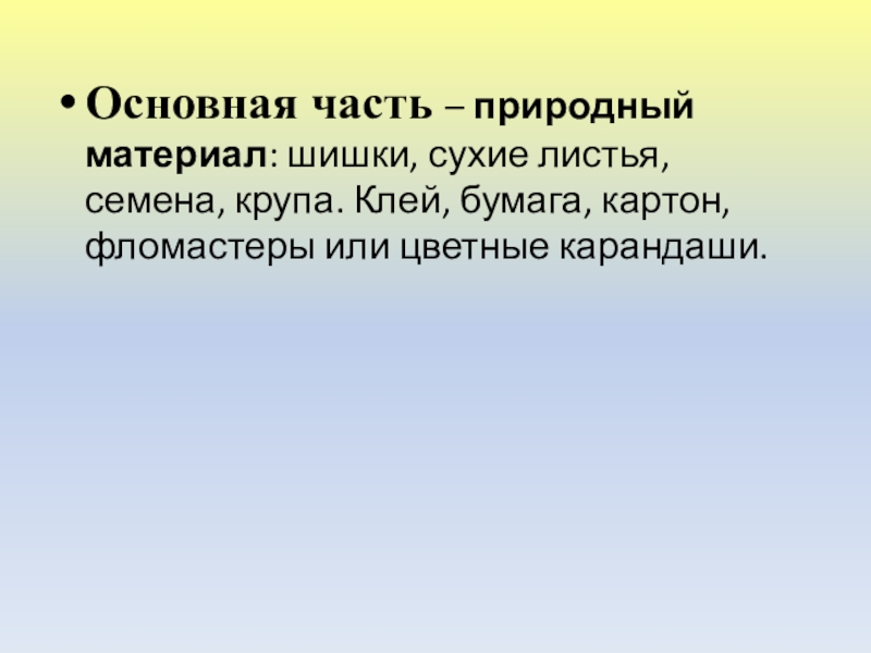 Основная часть – природный материал: шишки, сухие листья, семена, крупа. Клей, бумага, картон,фломастеры или цветные карандаши.