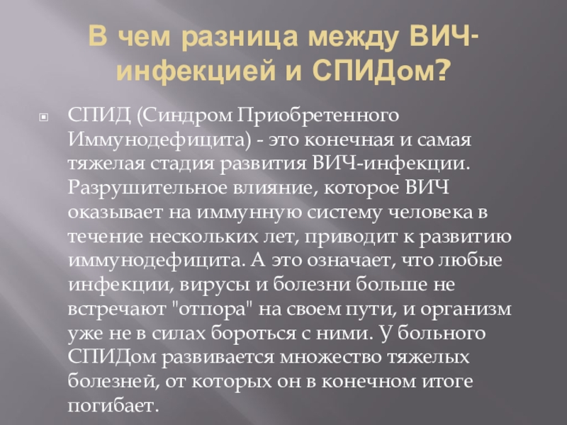 это конечная и самая тяжелая стадия развития ВИЧ-инфекции. Разрушительное влияние, которое ВИЧ оказывает на иммунную систему человека в течение нескольких лет, приводит к развитию иммунодефицита. А это означает, что любые инфекции, вирусы и болезни больше не встречают "отпора" на своем пути, и организм уже не в силах бороться с ними. У больного СПИДом развивается множество тяжелых болезней, от которых он в конечном итоге погибает.