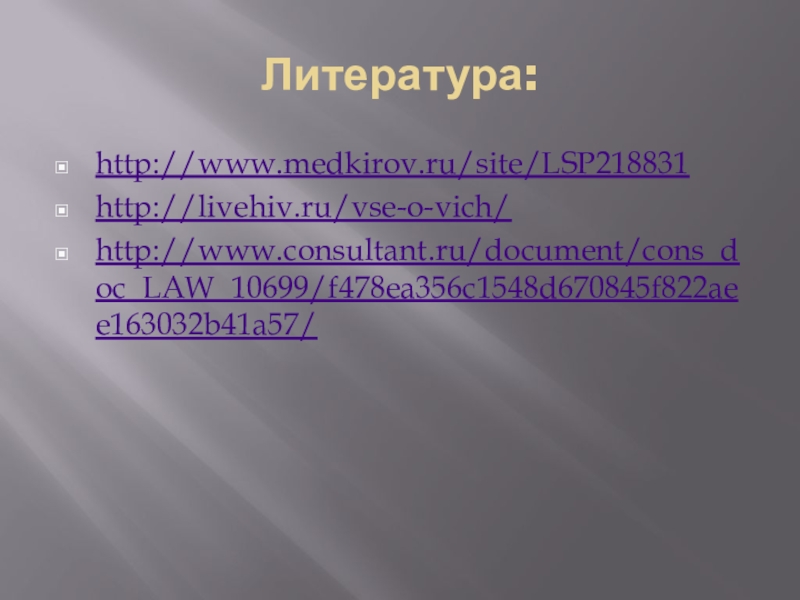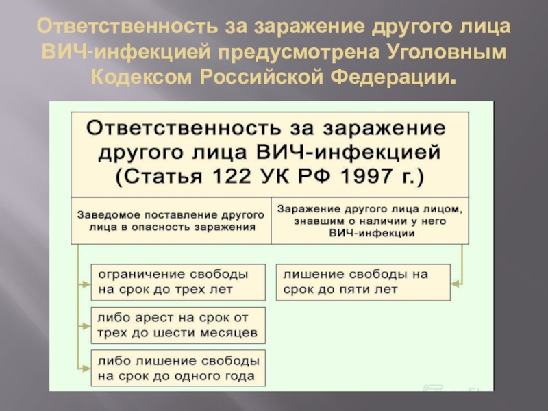 Слайд 15Ответственность за заражение другого лица ВИЧ-инфекцией предусмотрена Уголовным Кодексом Российской Федерации.